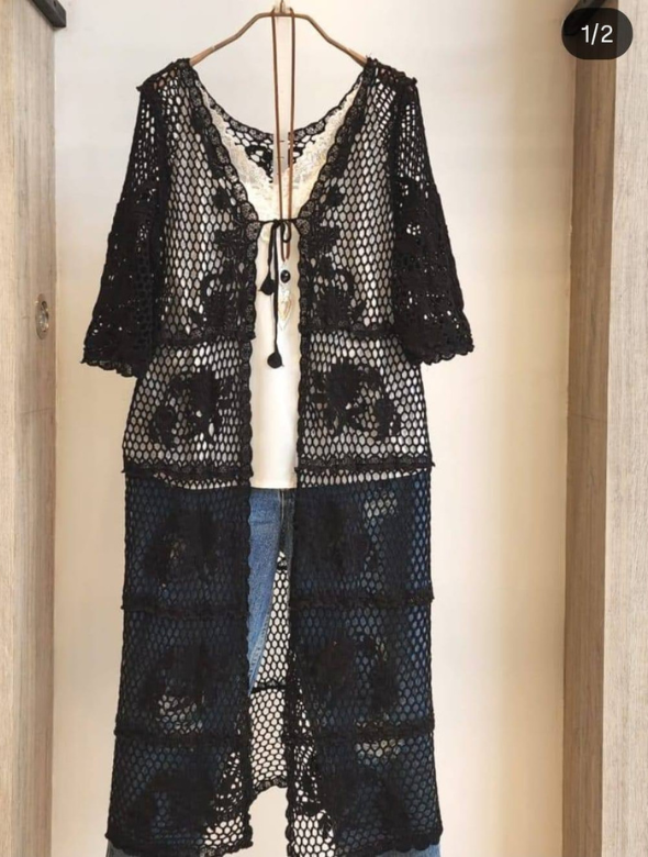 Eleva tus looks con este espectacular kimono largo de tejido calado en color negro. Su diseño liviano y translúcido aporta un toque sofisticado y femenino, perfecto para complementar cualquier outfit con estilo.